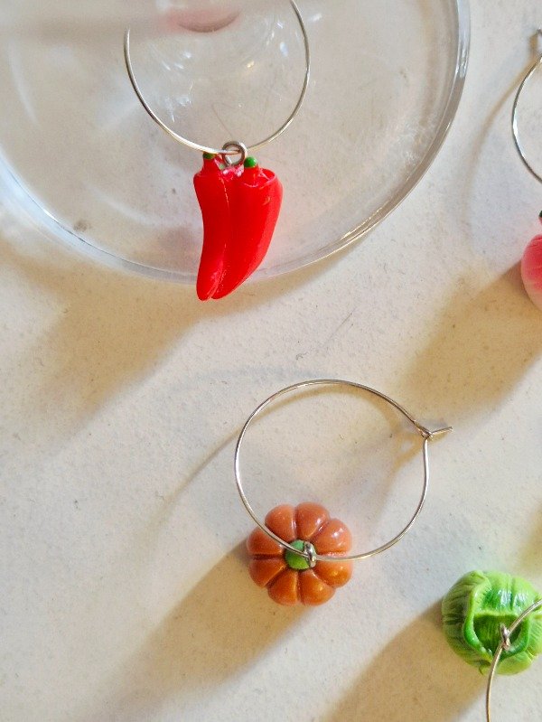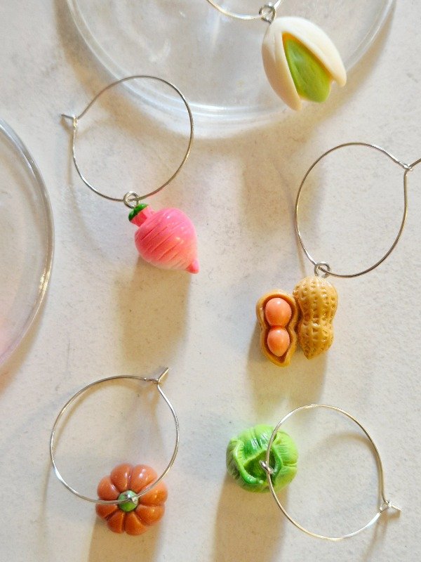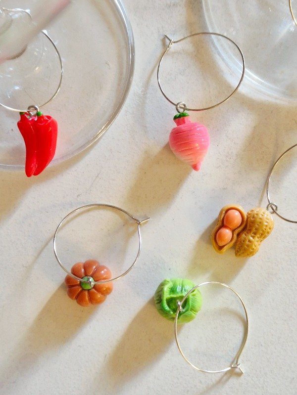 Marca copas realizados con arandelas metálicas y detalles de figuras colgantes en forma de verduras.