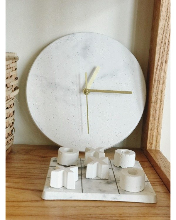 Reloj moldeado a mano, realizado en concreto. Terminación con laca satinada.